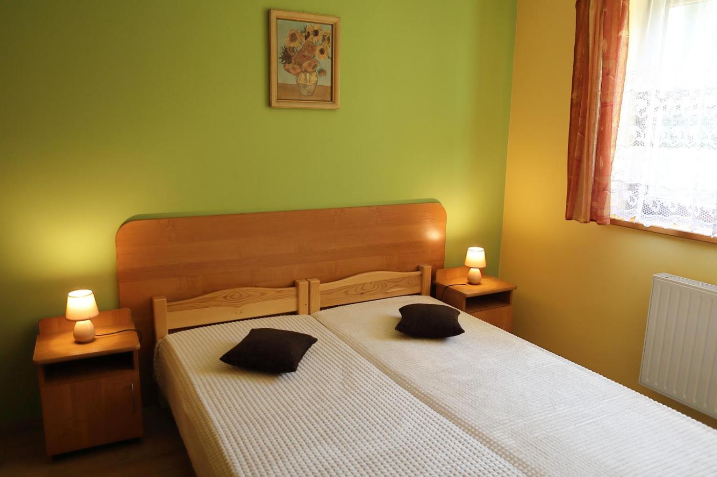 Pokój czteroosobowy z prywatną łazienką. The quadruple room offers a private entrance, a wardrobe, a terrace with garden views as well as a private bathroom featuring a shower. The unit offers 4 beds. Pokój Czteroosobowy - 4 osobowy. Powierzchnia pokoju ok.: 20 mkw.