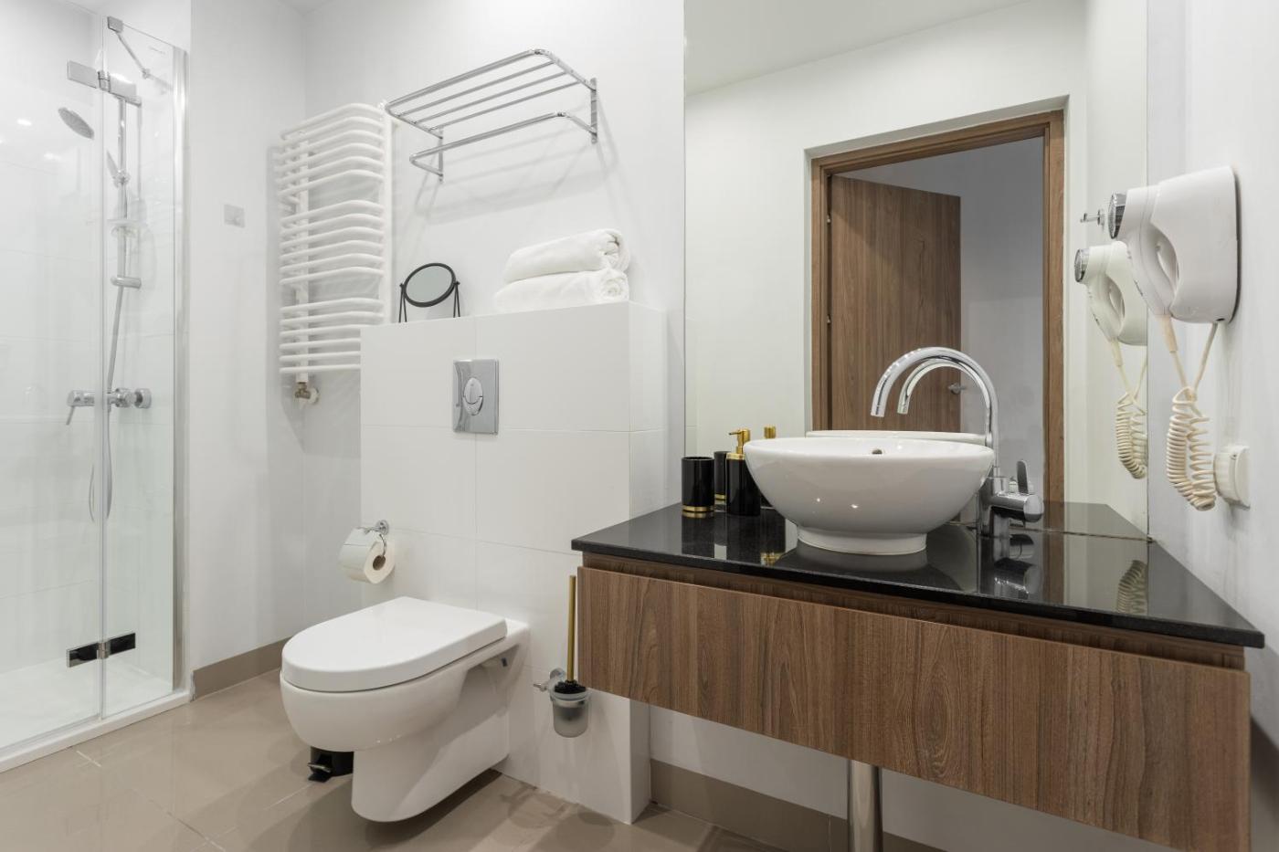 Studio. The studio provides a seating area, a dining area, as well as a private bathroom boasting a shower and a hairdryer. Guests can make meals in the kitchen that has a stovetop, a refrigerator, kitchenware and an oven. The spacious air-conditioned studio features a flat-screen TV with cable channels, a washing machine, soundproof walls, a tea and coffee maker as well as garden views. The unit has 2 beds. Studio - 4 osobowy. Powierzchnia pokoju ok.: 47 mkw.